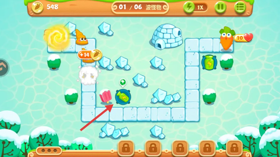 1、通过在地图路线两侧建造炮塔来阻止怪物靠近萝卜。