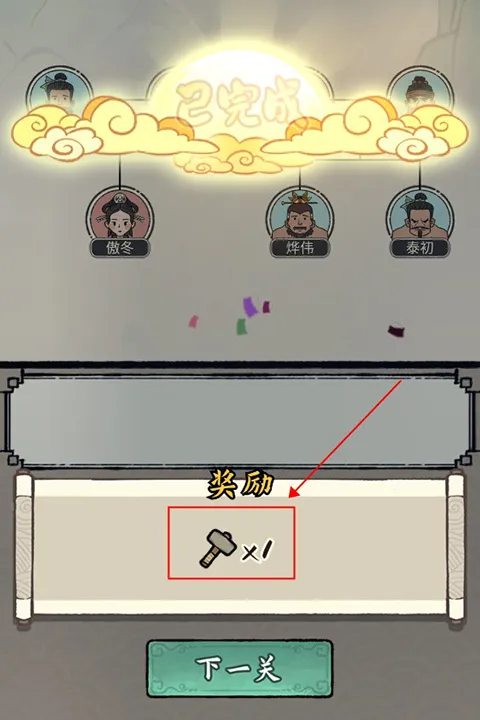 5、所有圆框正确填入就可以通关并获得锤子奖励啦。